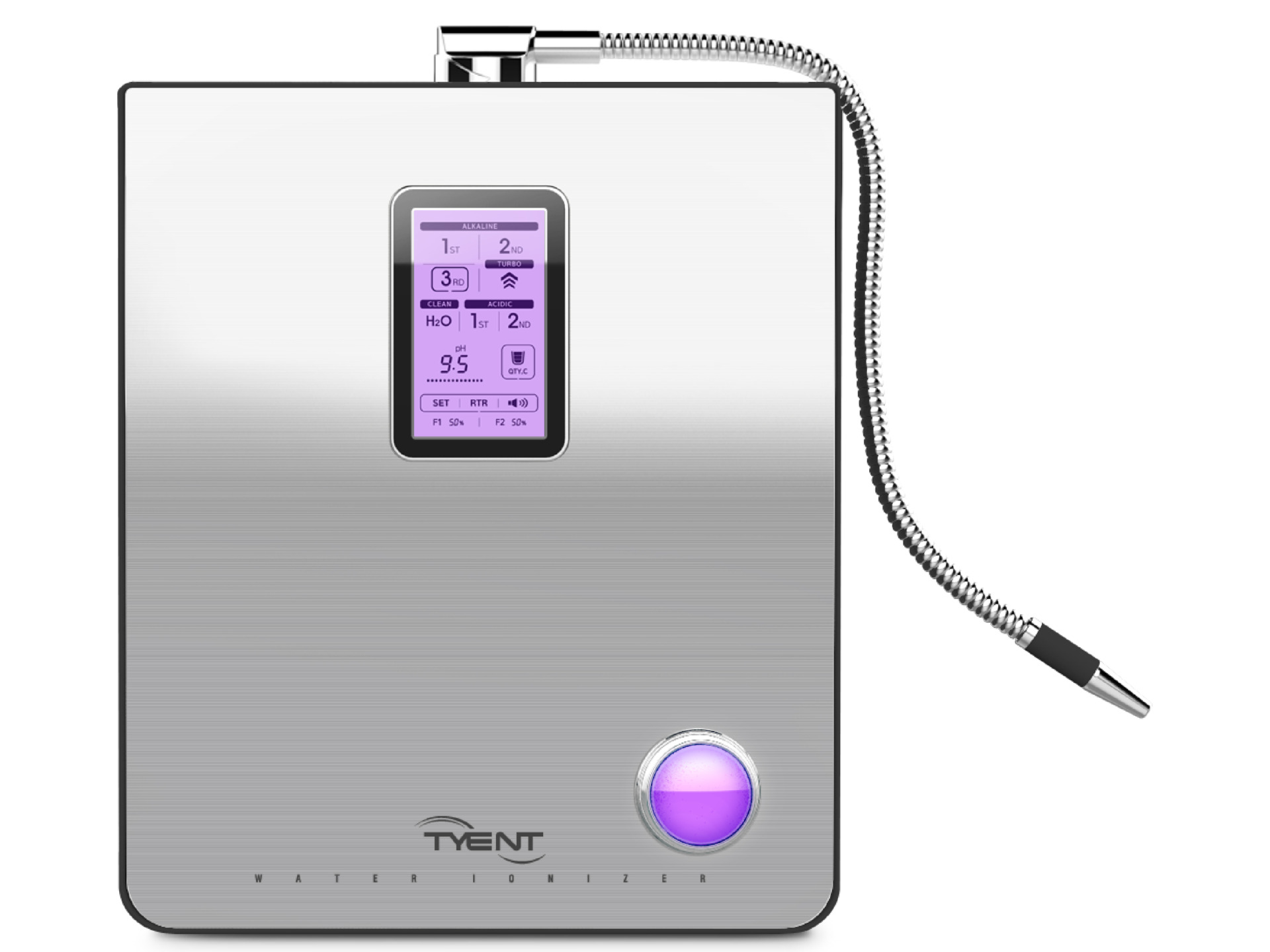 Máy lọc nước ion kiềm Tyent được trang bị chức năng Turbo cho phép tạo ra nước có tính axit mạnh pH< 4.0 giúp khử trùng, sát khuẩn và vệ sinh các dụng cụ nhà bếp. Dùng nước axit mạnh để rửa tay trước khi ăn uống giúp tay sạch tự nhiên và hạn chế sử dụng các loại hóa chất tẩy rửa như xà phòng. Lưu ý sau khi sử dụng nước axit mạnh để vệ sinh các vật dụng bằng kim loại cần lau sạch bằng vải khô vì kim loại dễ bị gỉ do tính oxi hóa của nước axit.