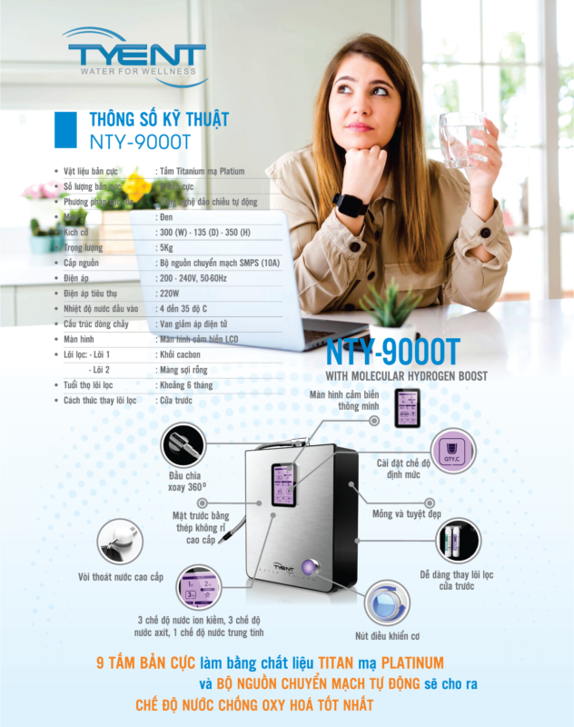 Máy điện giải Tyent NTY 9000T được Thế Giới Nước Tốt nhập khẩu chính hãng từ Tyent Hàn Quốc – thương hiệu điện giải hàng đầu Thế giới trong việc áp dụng công nghệ trí tuệ nhân tạo vào sản xuất Máy điện giải bảo vệ sức khỏe con người.