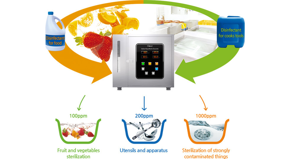 The solution produced is commonly used in areas that require sterilization and disinfection as it has strong sterilizing power especially against germs and viruses, including resistant bacteria and COVID19. This is an innovative HACCP product that provides both sanitation and safety as well as solves the problem of handling harsh, toxic chemicals that are bad for our skin as well as our environment.